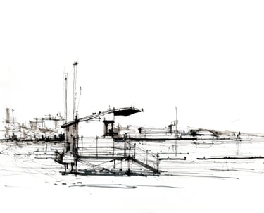 A moody digital sketch of a harbor at dusk, with boats gently bobbing and reflections shimmering on the water.