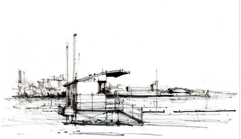 A curated selection of sketches capturing cityscapes, rural scenes, and marine views.